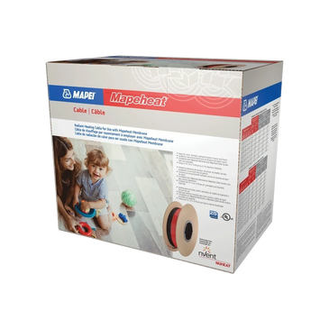 Mapeheat Cable is a free-form, twisted-pair, floor-heating cable for use in any residential interior room where the comfort of radiant floor heating is desired. The cable can be spaced on site to provide 10, 12 or 15 W per sq. ft. based on the desired wattage output requirements of the installation. Mapeheat Cable is available in 33 lengths to accommodate areas as small as 6 sq. ft. (0.56 m²) and up to 293 sq. ft. (27.2 m²).